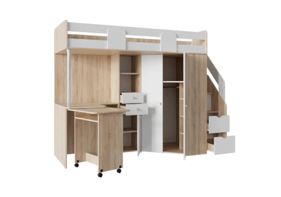 Благодаря универсальной сборке и универсальному углу, эту кровать-чердак можно легко адаптировать под планировку комнаты. Значит, даже в небольшой комнате она будет смотреться уместно и не займёт слишком много места, оставив пространство для игр или других активностей.